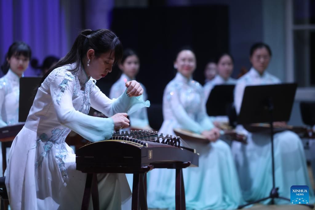 A member of China's Nanjing University's Traditional Instruments Orchestra plays Guzheng during a concert of Chinese classical music in Ljubljana, Slovenia, on Oct. 2, 2023. (Photo by Zeljko Stevanic/Xinhua News Agency)
