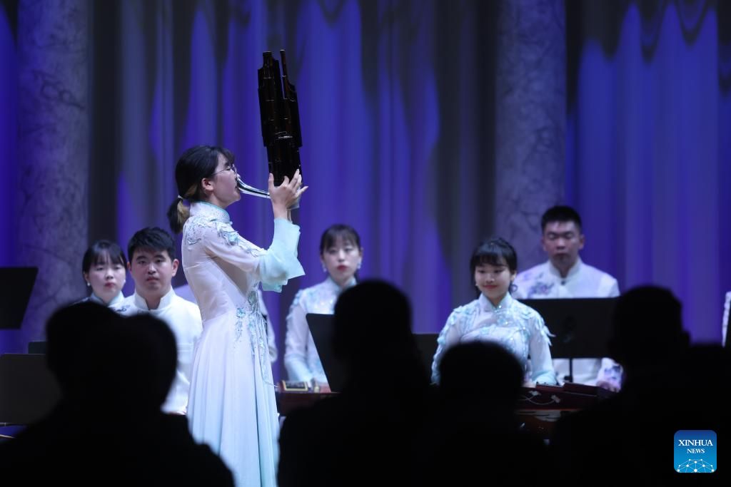 A member of China's Nanjing University's Traditional Instruments Orchestra plays Sheng during a concert of Chinese classical music in Ljubljana, Slovenia, on Oct. 2, 2023. (Photo by Zeljko Stevanic/Xinhua News Agency)