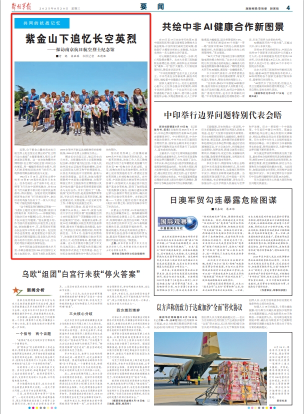 以紫金山为背景,15米高的航空烈士纪念碑巍然耸立。视线顺着如两把利剑的纪念碑直上云天,战机轰鸣声、炸弹呼啸声,恍然仍在耳畔。“英烈用生命捍卫的和平天空,如今奏响着发展的乐章,回荡着幸福的欢笑。在推动构建人类命运共同体的过程中,传承和弘扬在战争中凝结的珍贵友谊,既是对英魂的告慰,也是对和平发展时代强音的回应。”薛莲说。