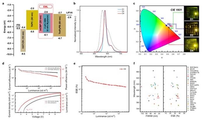 基于HBN分子的非敏化器件D1实现了580 nm的窄带电致发光(FWHM:24 nm)及26.7%的最大外量子效率(EQEmax),但存在效率滚降问题。通过优化OLED器件的结构,引入磷光敏化荧光(PSF)结构后,通过使用铱(III)配合物Bt?Ir(acac)作为敏化剂并优化掺杂浓度,PSF器件D4表现出高效率(EQEmax:36.1%)、窄EL发射(FWHM:25 nm)及低效率滚降的特点,并在高亮度下保持优异性能,展示了其在高性能光电器件中的广泛应用潜力。