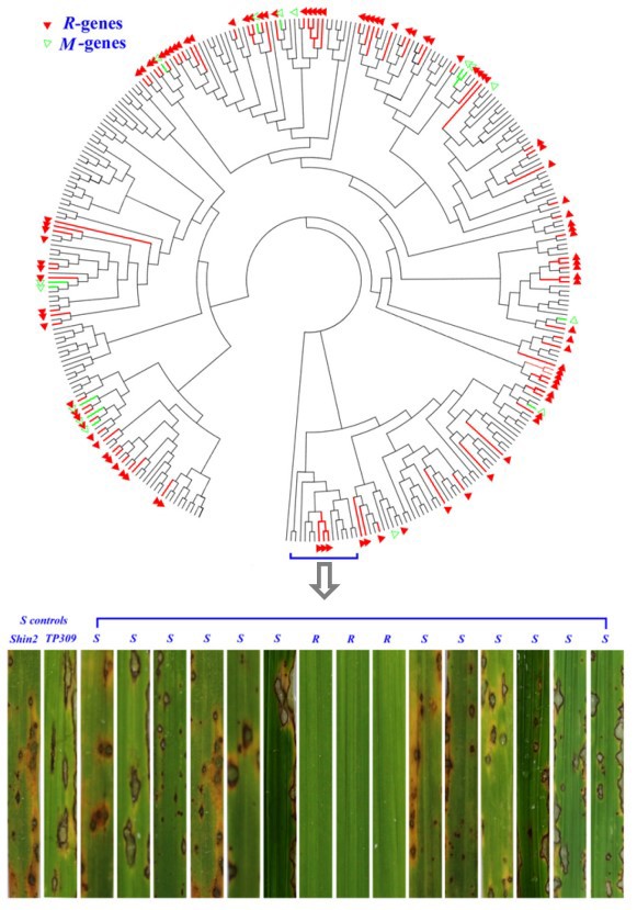 图:克隆的332个NBS-LRR基因的进化关系和转基因株系稻瘟病菌侵染后的代表表型。